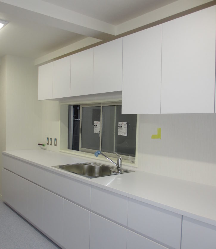 ワイド4000弱の消毒コーナーキャビネットを製造、取付させて頂きました。手洗いシンク付、引き出しはソフトクローズ仕様、吊り棚も収納力抜群!